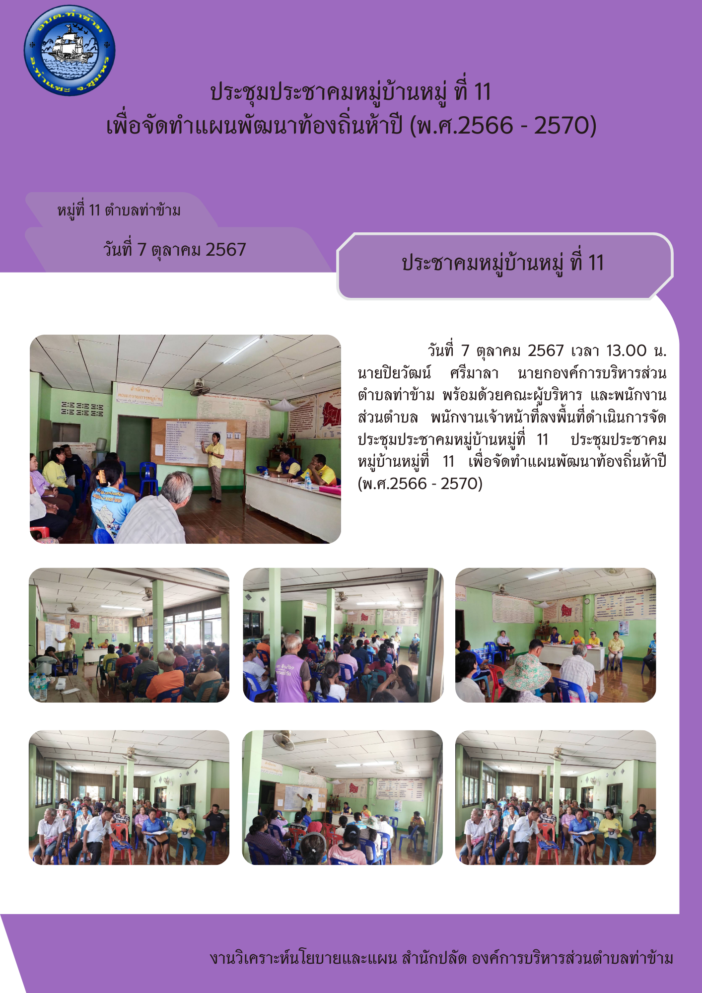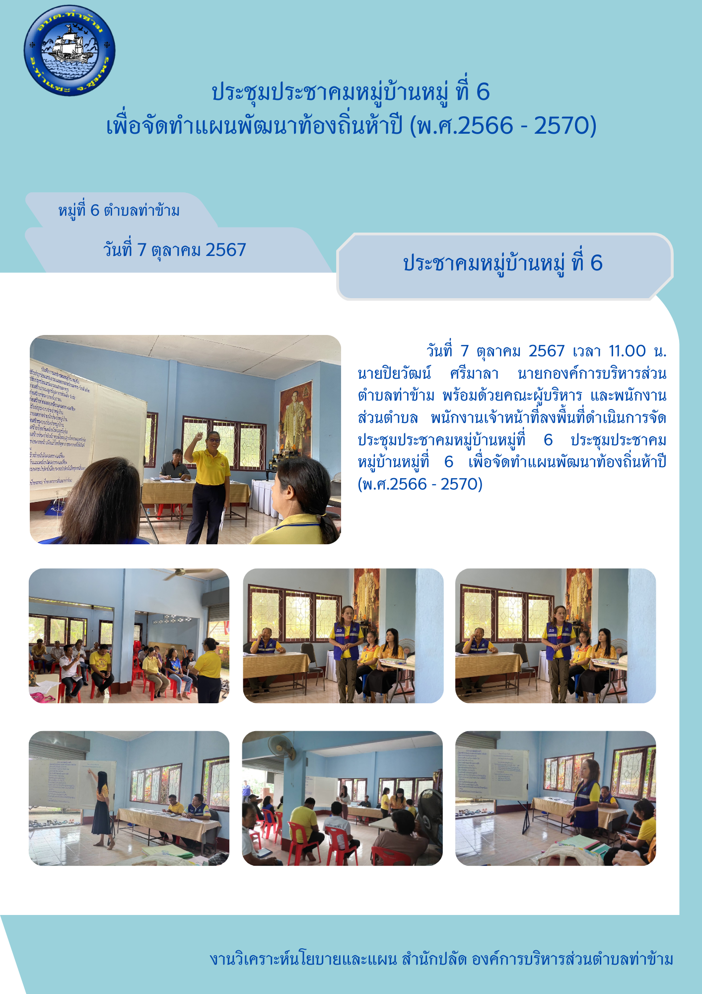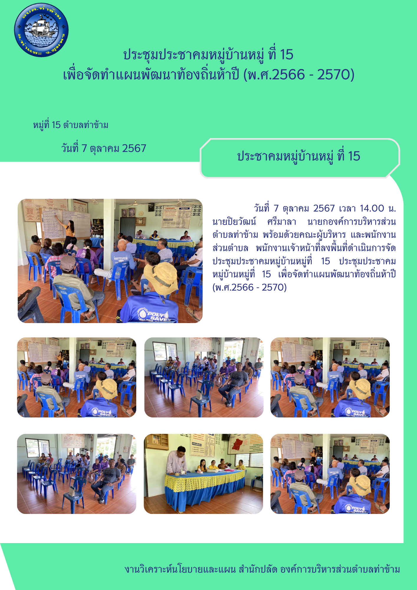 รายละเอียด : วันที่ 7 ตุลาคม 2567 เวลา 09.00 - 15.00 น.นายปิยวัฒน์ ศรีมาลา นายกองค์การบริหารส่วนตำบลท่าข้าม พร้อมด้วยคณะผู้บริหาร และพนักงานส่วนตำบล พนักงานเจ้าหน้าที่ลงพื้นที่ดำเนินการจัดประชุมประชาคมหมู่บ้านหมู่ที่3,6,11 และหมู่ที่ 15 ประชุมประชาคมหมู่บ้านเพื่อจัดทำแผนพัฒนาท้องถิ่นห้าปี (พ.ศ.2566 - 2570)