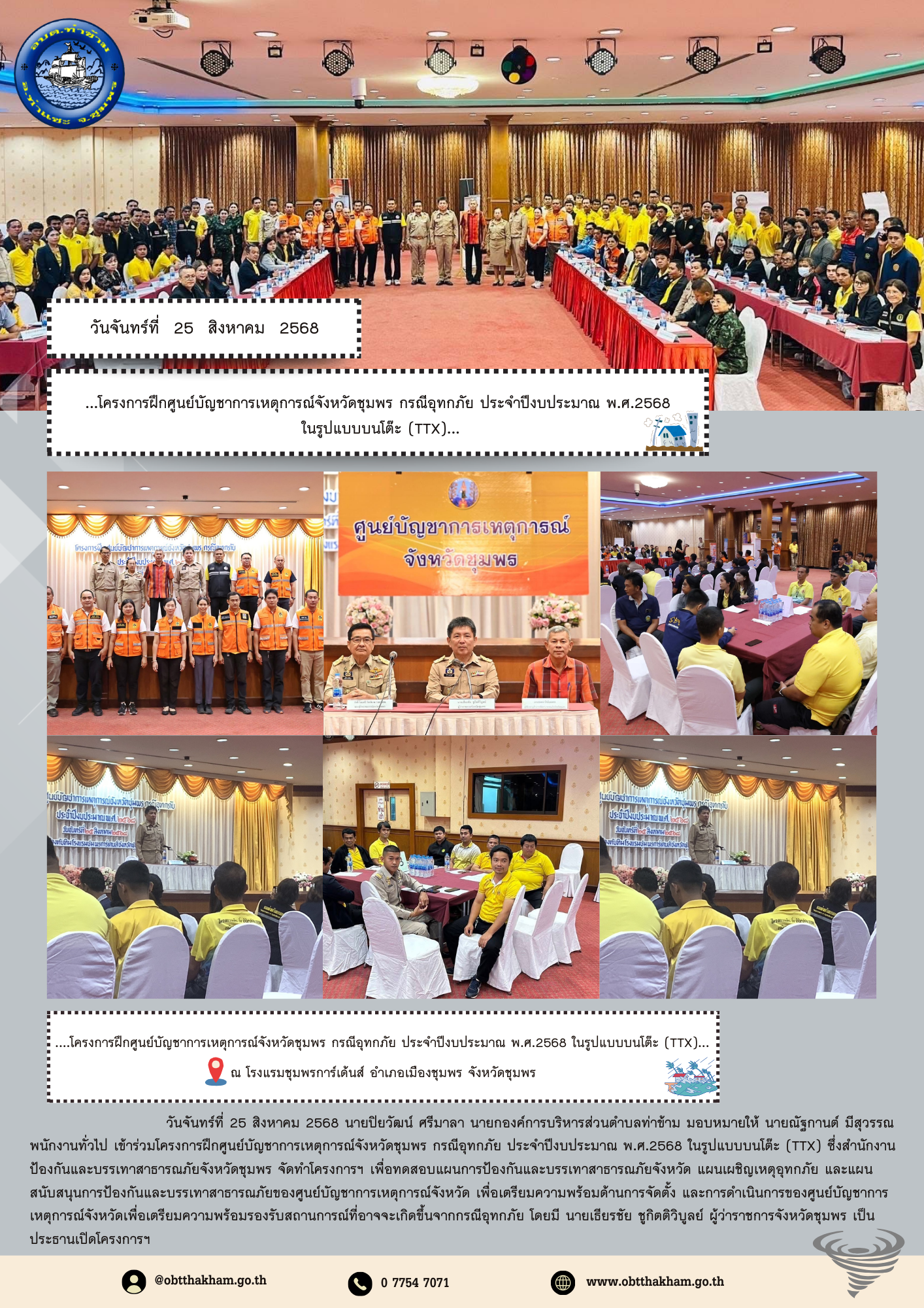 ....โครงการฝึกศูนย์บัญชาการเหตุการณ์จังหวัดชุมพร กรณีอุทกภัย ประจำปีงบประมาณ พ.ศ.2568 ในรูปแบบบนโต๊ะ (TTX)... [27 สิงหาคม 2568]