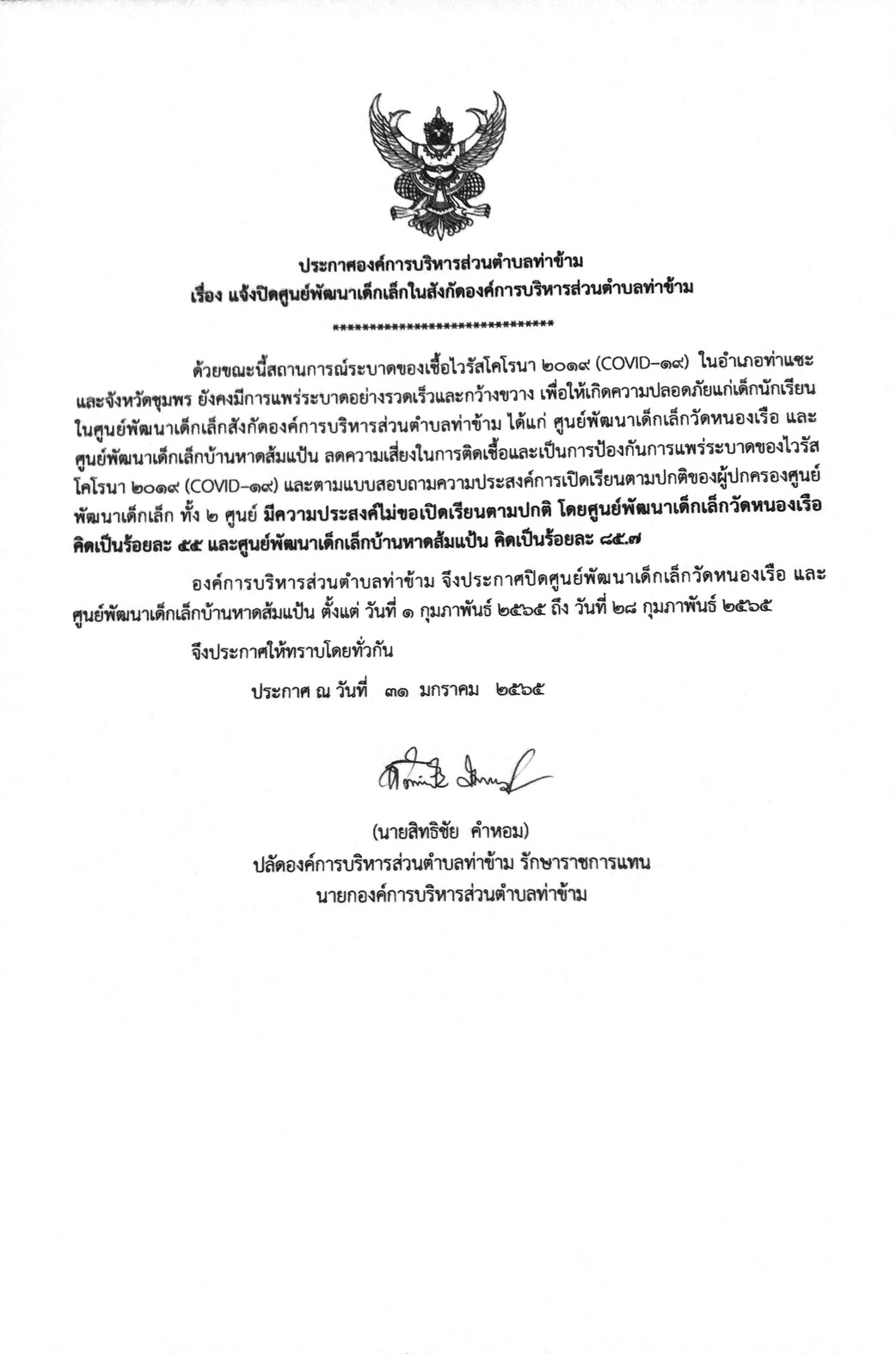 องค์การบริหารส่วนตำบลท่าข้าม จึงปิดประกาศปิดศูนย์พัฒนาเด็กเล็กวัดหนองเรือ และ ศูนย์พัฒนาเด็กเล็กบ้านหาดส้มแป้น ตั้งแต่วันที่ 1 กุมภาพันธ์ 2565 ถึง วันที่ 28 กุมภาพันธ์ 2565 จึงประกาศให้ทราบโทยทั่วกัน