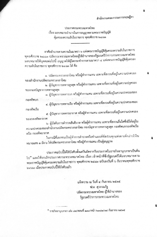 รายละเอียด : ประกาศกระทรวงมหาดไทย เรื่อง มอบหมายอำนาจในการอนุญาตตามพระราชบัญญัติคุ้มครองความลับในราชการ พุทธศักราช 2443
