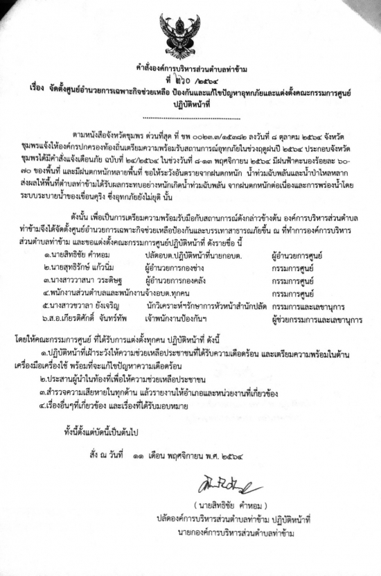 ตามหนังสือจังหวัดชุมพร ด่วนที่สุด ชพ 0023.3/15382 ลงวันที่ 8 ตุลาคม 2564 จังหวัดชุมพรแจ้งให้องค์การบริหารกรปกครองท้องถิ่นเตรียมความพร้อมรับสถานการณ์อุทกภัยภัยในช่วงฤดูฝน 2564 ประกอบกับจังหวัดชุมพรได้มีคำสั่งแจ้งเตือนภัย ฉบับที่ 2/2564 ในช่วงวันที่ 8-13 พฤศจิกายน 2564