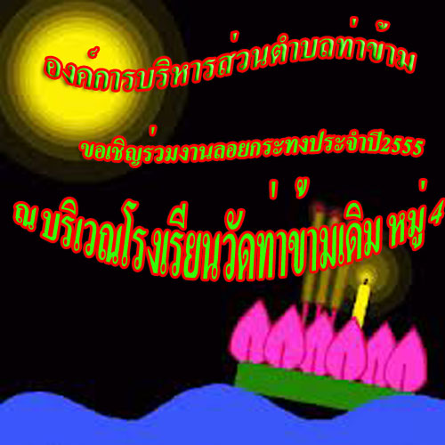 ขอเชิญร่วมงานลอยกระทงประจำปี 2555 ณ บริเวณโรงเรียนวัดท่าข้ามเดิม หมู่ 4 ภายในมีการประกวดนางนพมาศ, ประกวดกระทง, รำวง, มวย