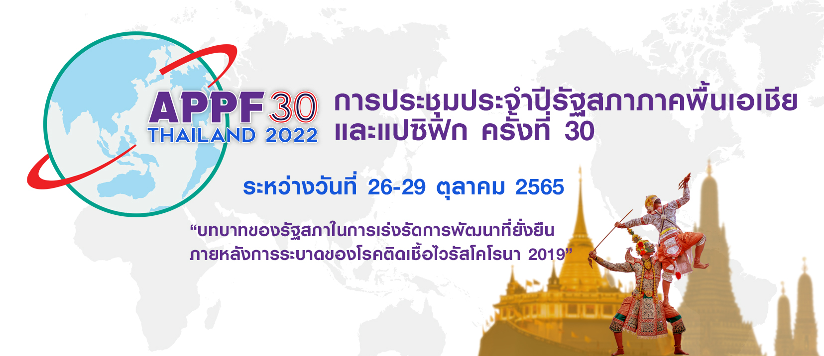 รายละเอียด : ในปี พ.ศ. 2565 รัฐสภาเป็นเจ้าภาพการจัดประชุมรัฐสภาภาคพื้นเอเชียและแปซิฟิก ครั้งที่ 30 : Asia Pacific Parliamentary Fourum (APPF 30) เพื่อหารือเรื่อง "บทบาทของรัฐสภาในการเร่งรัดการพัฒนาที่ยั่งยืนภายหลังการระบาดของโรคติดเชื้อไวรัสโคโรนา 2019 ระหว่างวันพุธ ที่ 36-29 ตุลาคม 2565 ณ อาคารรัฐสภา เพื่อประชาสัมพันธ์ข้อมูลข่าวสารต่าง ๆ ของการประชุม APPF ครังทีี่ 30 เพื่อให้ประชาชนในทุกภาคส่วนได้รับทราบและร่วมเป้นน้ำหนึ่งใจเดียวกันในการเป็นเจ้าภาพจัดการประชุม
