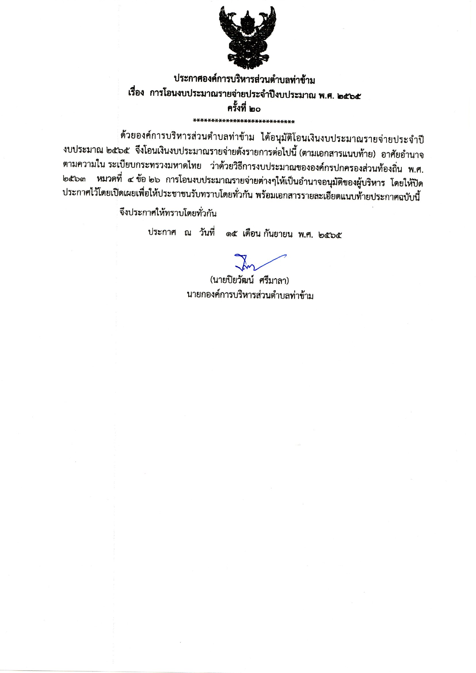 ประกาศองค์การบริหารส่วนตำบลท่าข้าม เรื่อง การโอนงบประมาณรายจ่ายประจำปีงบประมาณ พ.ศ. 2565 ครั้งที่ 20