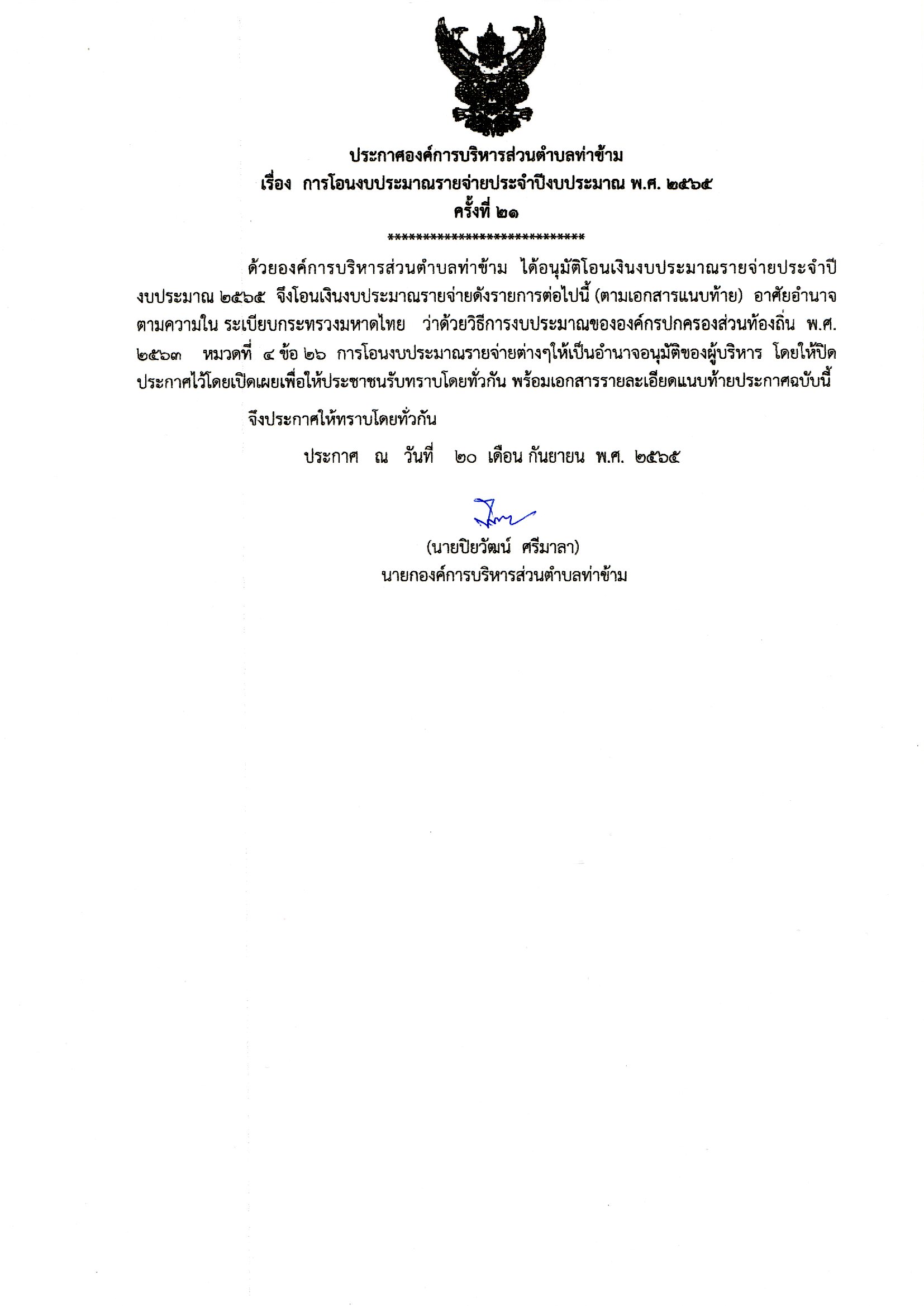 ประกาศองค์การบริหารส่วนตำบลท่าข้าม เรื่อง การโอนงบประมาณรายจ่ายประจำปีงบประมาณ พ.ศ. 2565 ครั้งที่ 21