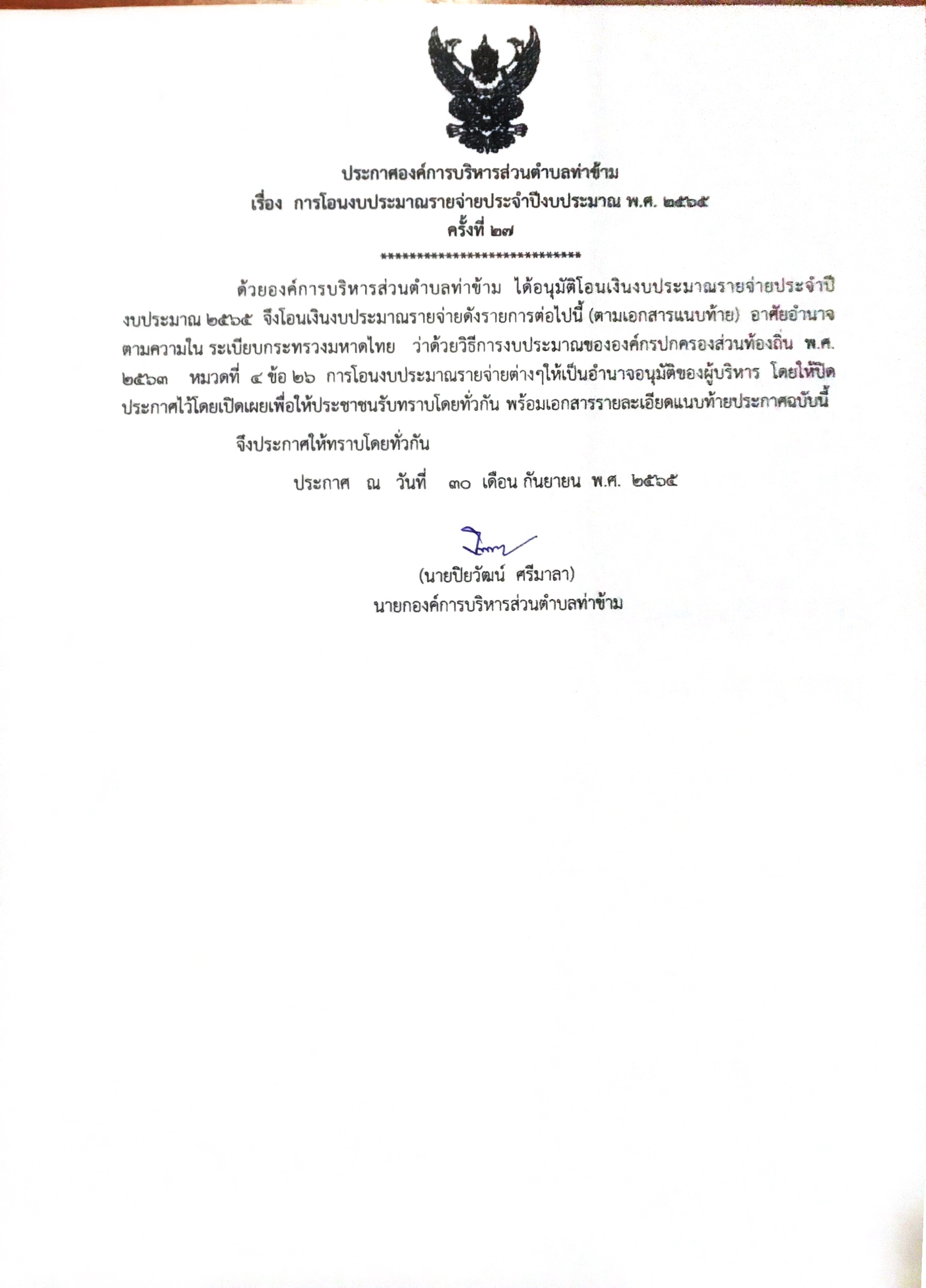 ประกาศองค์การบริหารส่วนตำบลท่าข้าม เรื่อง การโอนงบประมาณรายจ่ายประจำปี พ.ศ. 2565 ครั้งที่ 27