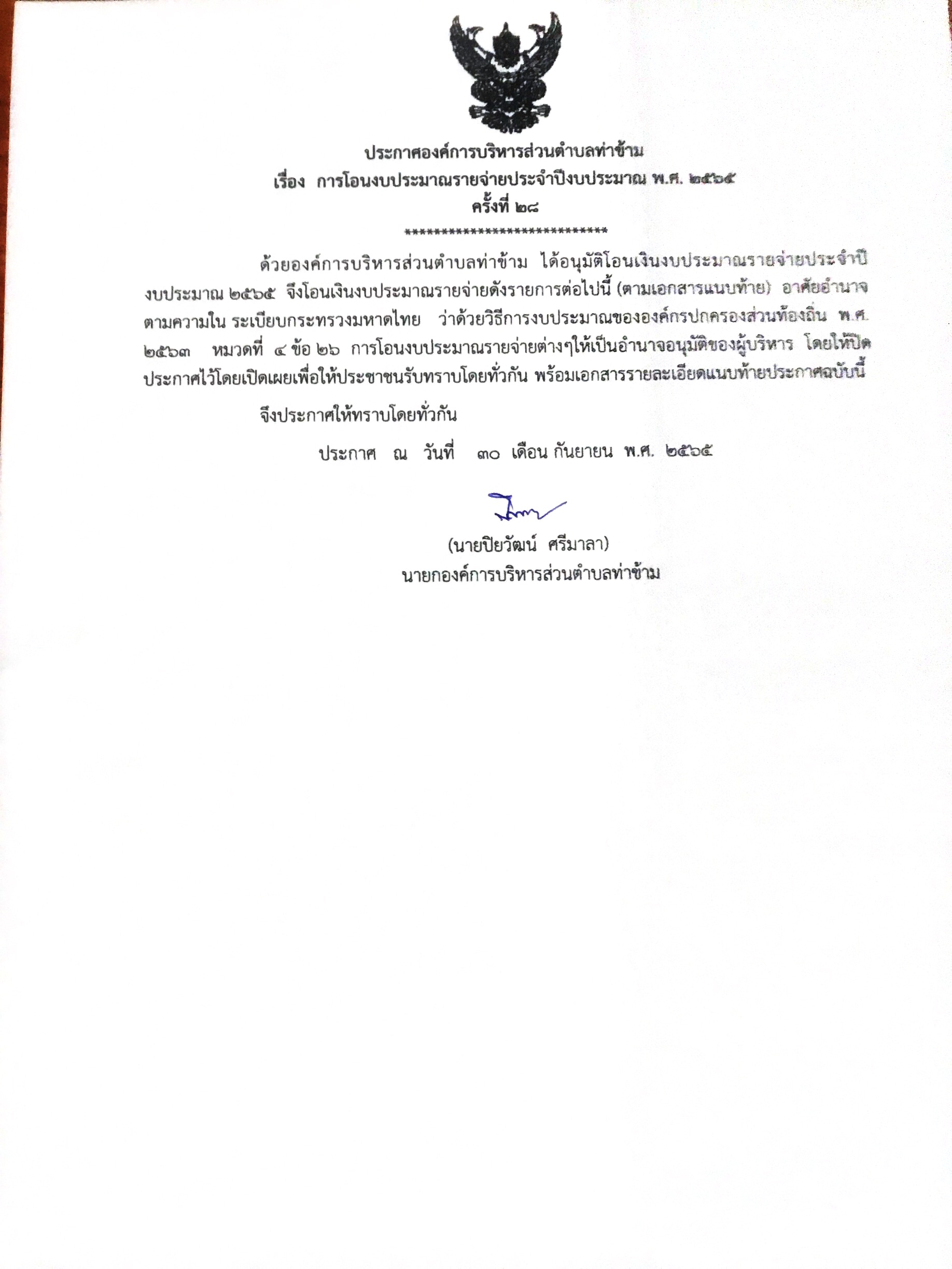 ประกาศองค์การบริหารส่วนตำบลท่าข้าม เรื่อง การโอนงบประมาณรายจ่ายประจำปี พ.ศ. 2565 ครั้งที่ 28