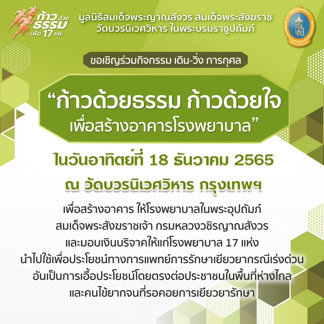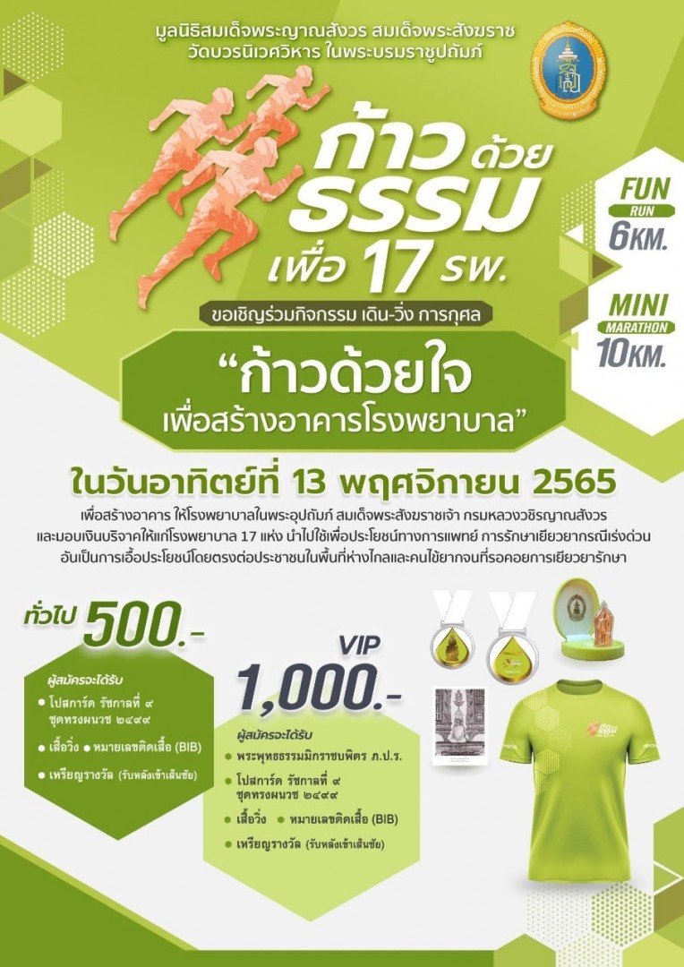 มูลนิธิสมเด็จพระญาณสังวร สมเด็จพระสังฆราช วัดบวรนิเวศวิหาร ในพระบรมราชูปถัมภ์ กำหนดจัดกิจกรรม เดิน - วิ่ง การกุศล ครั้ง 6 "ก้าวด้วยธรรม ก้าวด้วยใจ เพื่อสร้างโรงพยาบาล" ในวันอาทิตย์ที่ 18 ธันวาคม 2565