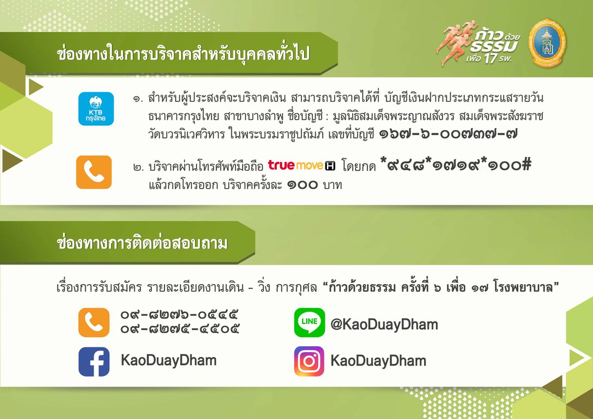รายละเอียด : กิจกรรม เดิน - วิ่ง การกุศล ครั้ง 6 "ก้าวด้วยธรรม ก้าวด้วยใจ เพื่อสร้างโรงพยาบาล"