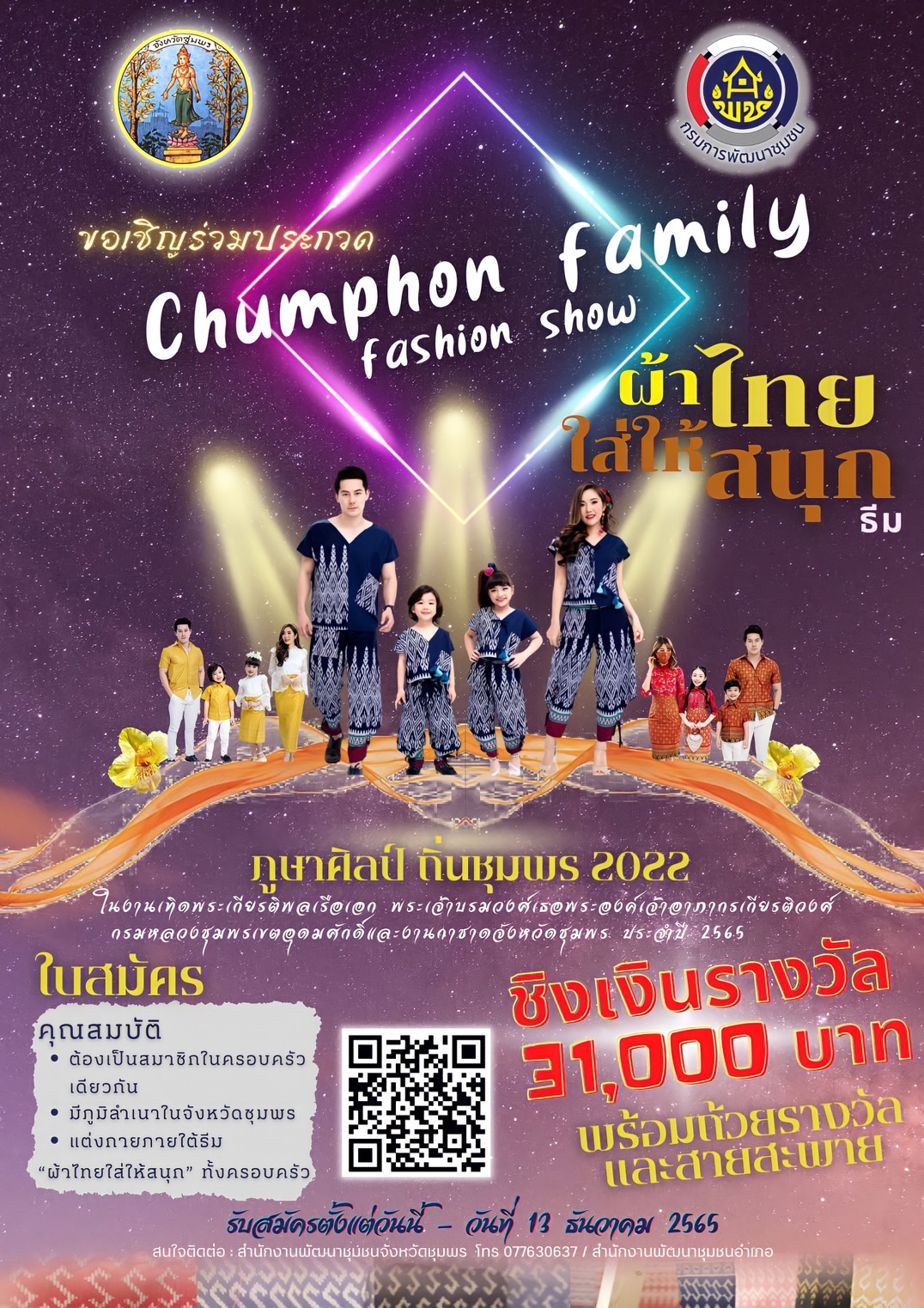รายละเอียด : ตามที่จังหวัดชุมพร กำหนดจัดงานทิดพระเกียรติพลเรือเอก พระเจ้าบรมวงศ์เธอ พระองค์เจ้าอาภากรเกียรติวงศ์ กรมหลวงชุมพรเขตอุดมศักดิ์ และงานกาชาดจังหวัดชุมพร ประจำปี 2565 ระหว่างวันที่ 18 - 26 ธันวาคม 2565 ณ บริเวณโครงการพัฒนาพื้รที่หนองใหญ่ตามพระราชดำริ ตำบลบางลึก อำเภอเมือง จังหวัดชุมพร ซึ่งภายในงานได้กำหนดให้มีการจัดกิจจกรรมประกวด "Chumphon Family Fashion Show" ภูษาศิลป์ ถิ่นชุมพร 2022 ดังนั้น เพื่อให้การจัดงานจัดกิจกรรมประกวด "Chumphon Family Fashion Show" ภูษาศิลป์ ถิ่นชุมพร 2022 เป็นไปด้วยความเรียบร้อยและมีประสิทธิภาพ จังหวัดชุมพรขอความร่วมมือประชาสัมพันธ์และรับสมัครผู้เข้าร่วมกิจกรรม รายละเอียดตามสื่งที่ส่งมาด้วย