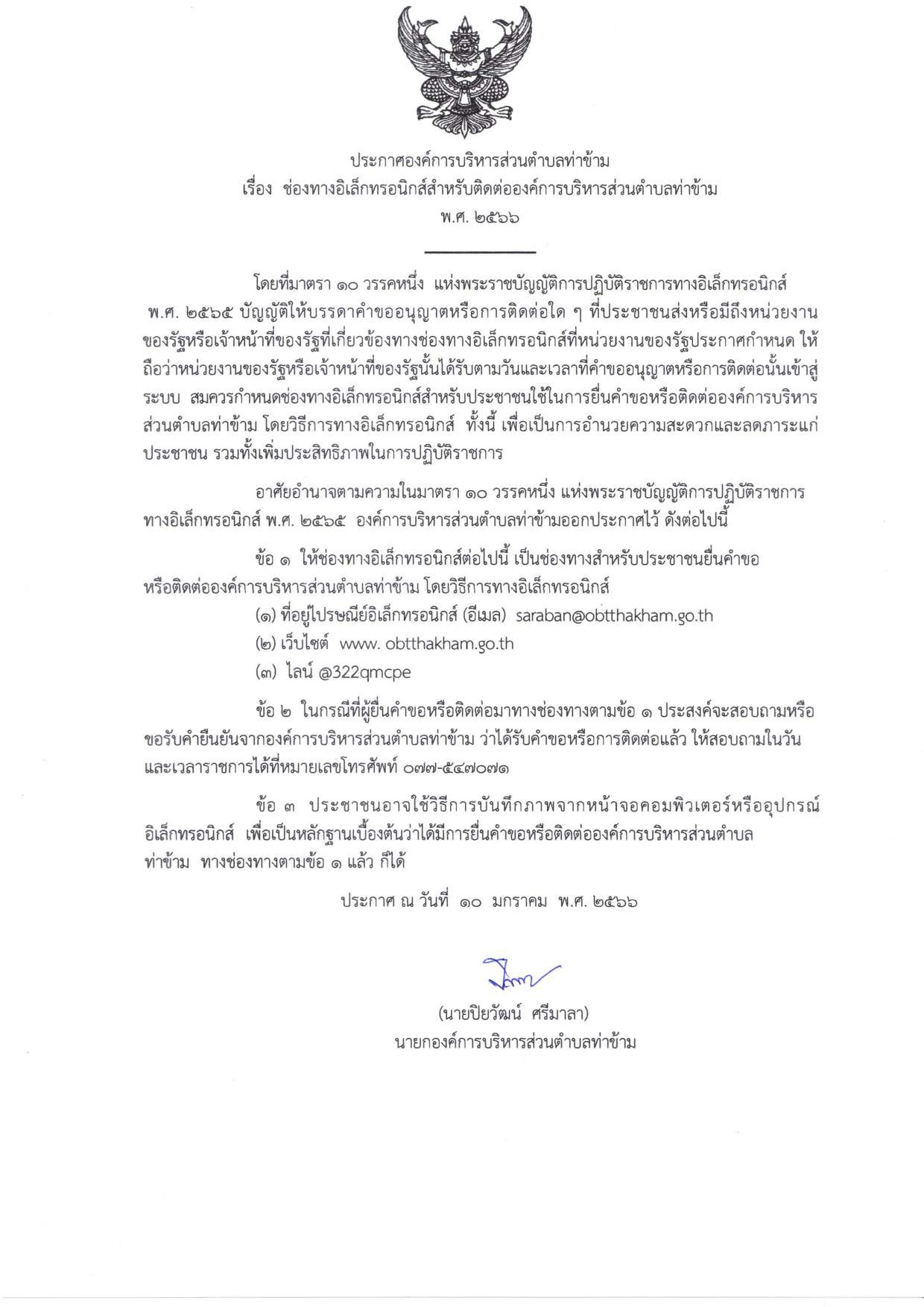 ชื่อเรื่อง : ประกาศองค์การบริหารส่วนตำบลท่าข้าม เรื่อง ช่องทางอิเล็กทรอนิกส์สำหรับติดต่อองค์การบริหารส่วนตำบลท่าข้าม พ.ศ. 2566