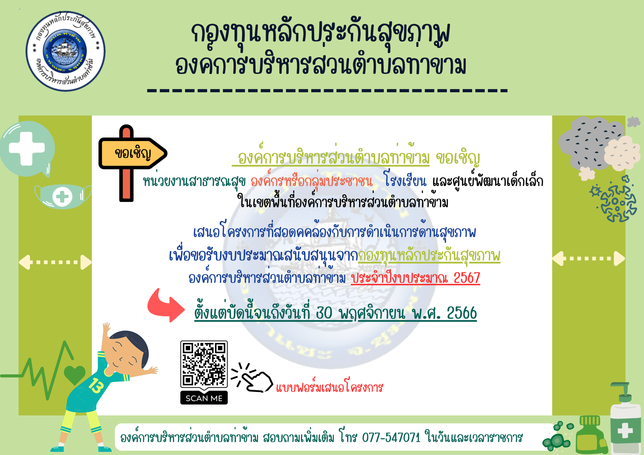 ขอเชิญชวนหน่วยงาน องค์กรหรือกลุ่มประชาชนและหน่วยงานอื่นๆ ร่วมส่งโครงการเพื่อขอรับงบประมาณสนับสนุนจากกองทุนหลักประกันสุขภาพองค์การบริหารส่วนตำบลท่าข้าม ประจำปีงบประมาณ 2567