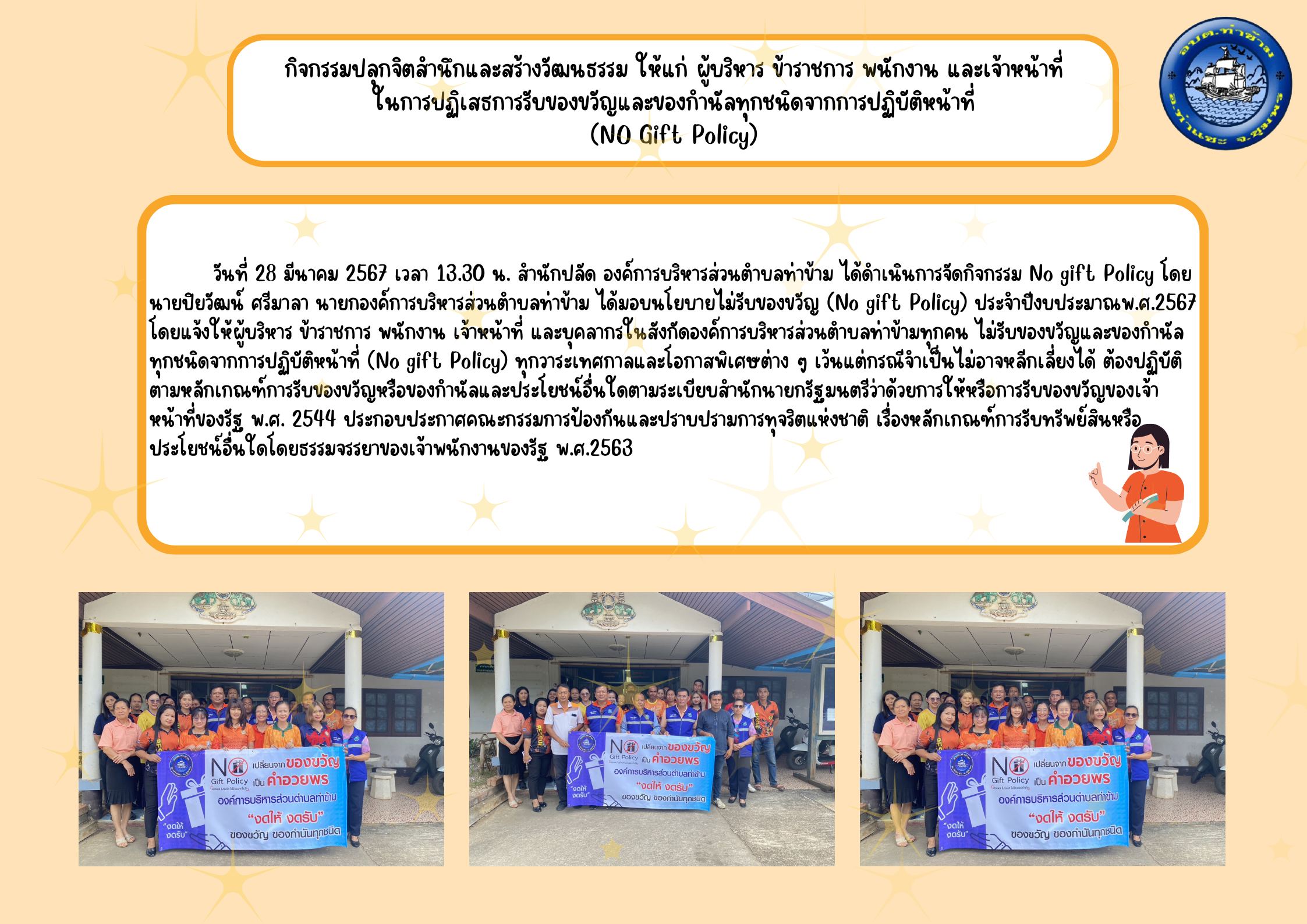 รายละเอียด : กิจกรรมปลุกจิตสำนึกและสร้างวัฒนธรรม ให้แก่ ผู้บริหาร ข้าราชการ พนักงาน และเจ้าหน้าที่ ในการปฏิเสธการรับของขวัญและของกำนัลทุกชนิดจากการปฏิบัติหน้าที่ (NO Gift Policy) ประจำปีงบประมาณ พ.ศ. 2567[28 มีนาคม 2567]
