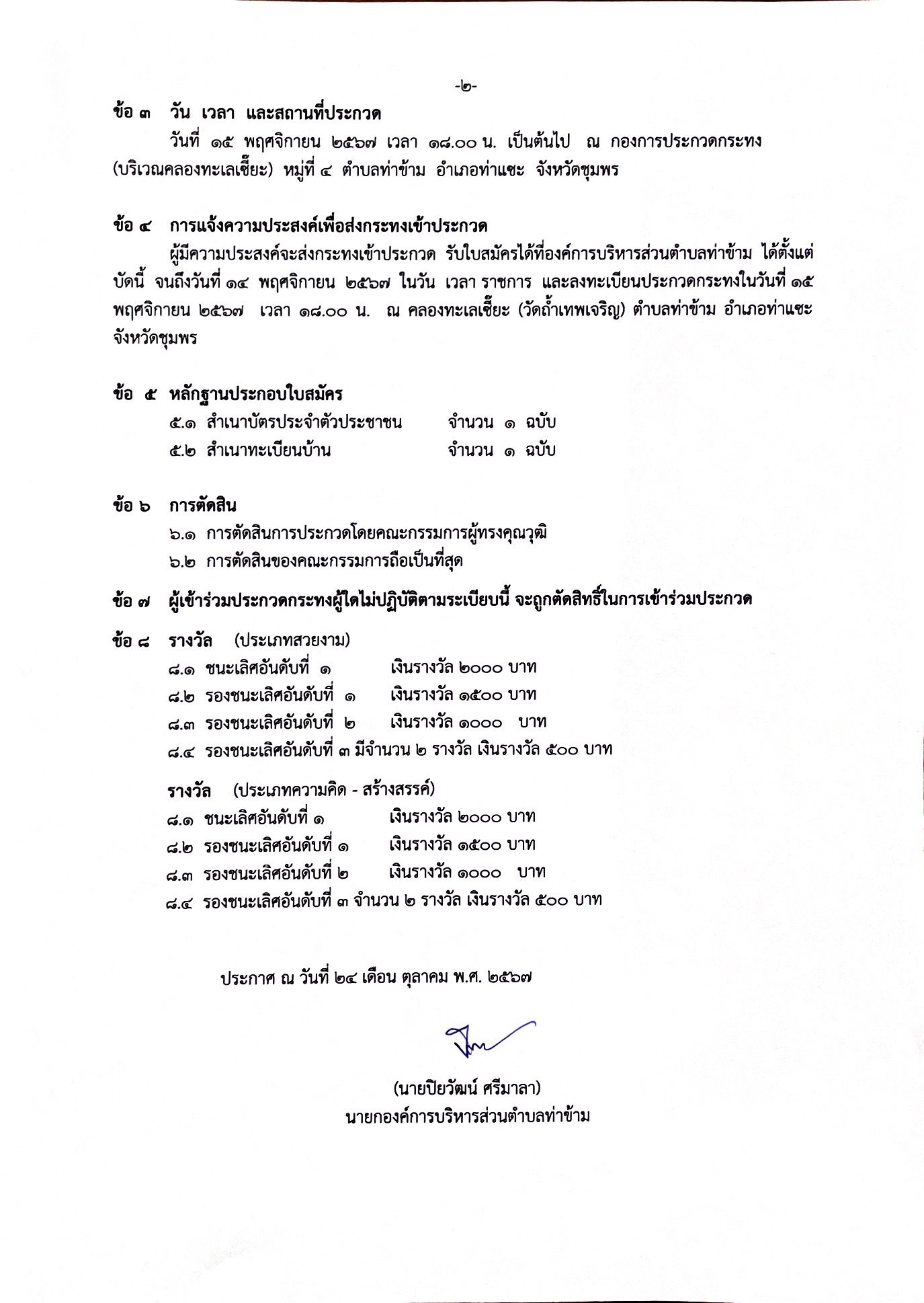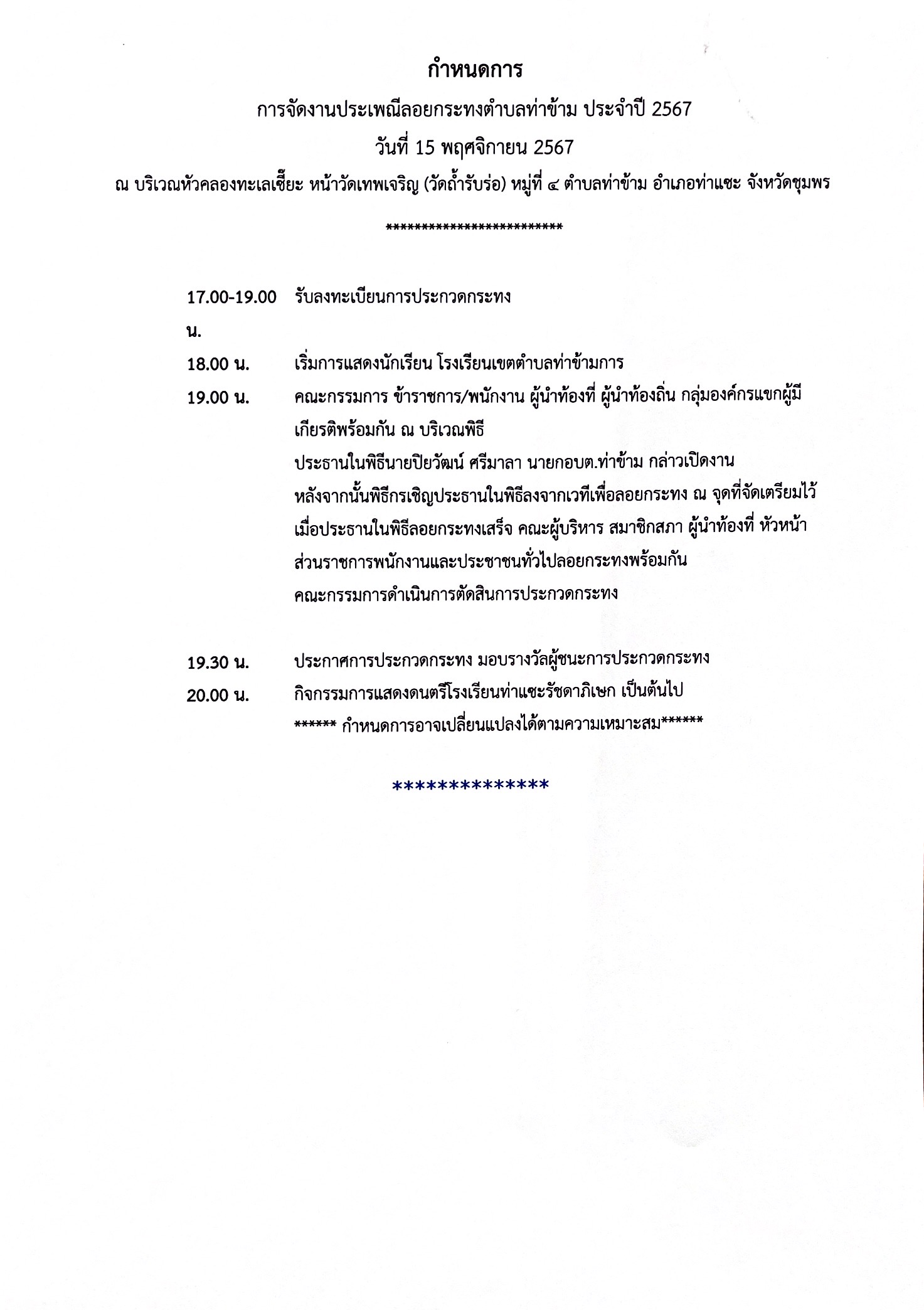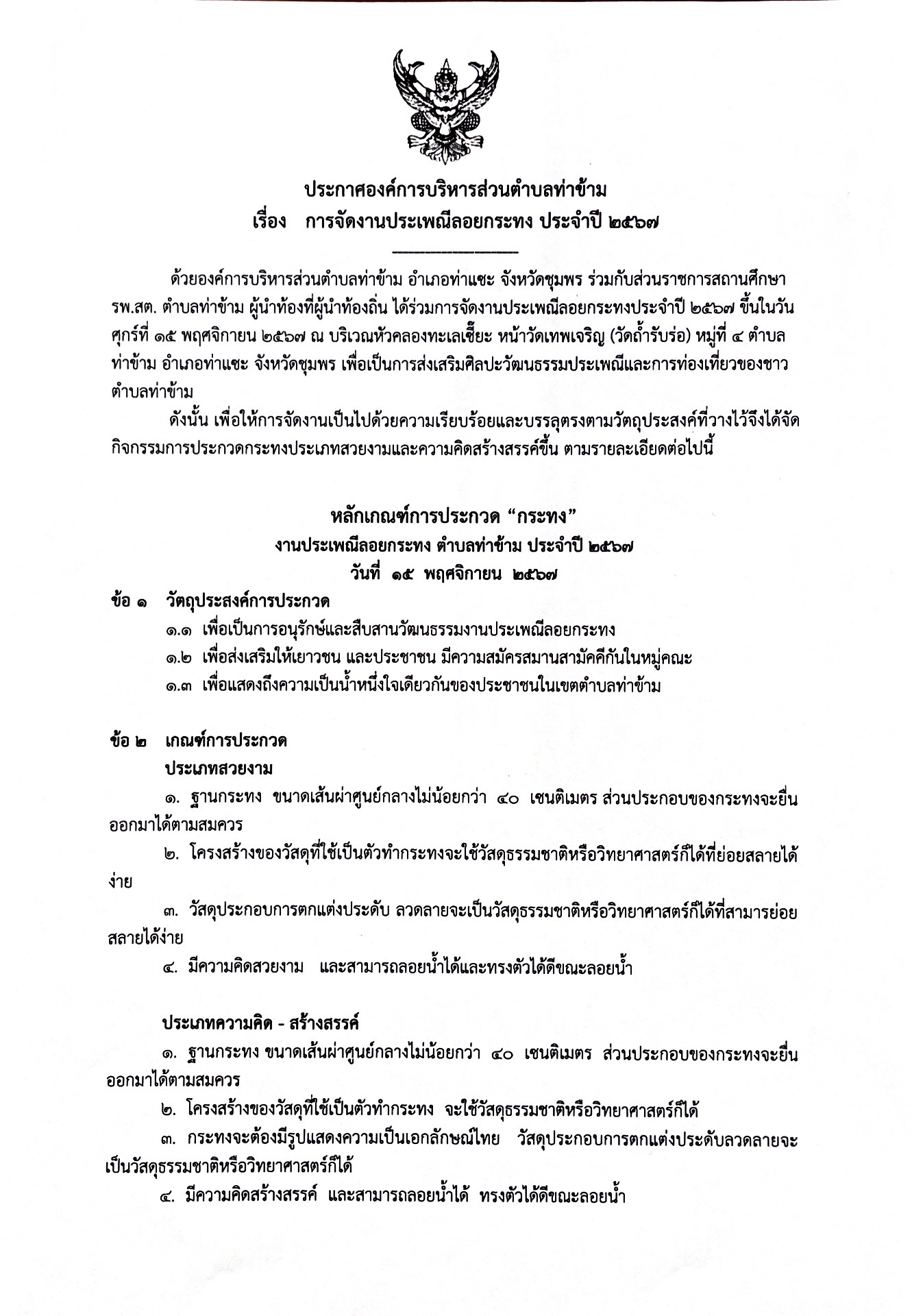 ประกาศองค์การบริหารส่วนตำบลท่าข้าม เรื่องการจัดงานประเพณีลอยกระทง ประจำปี 2567