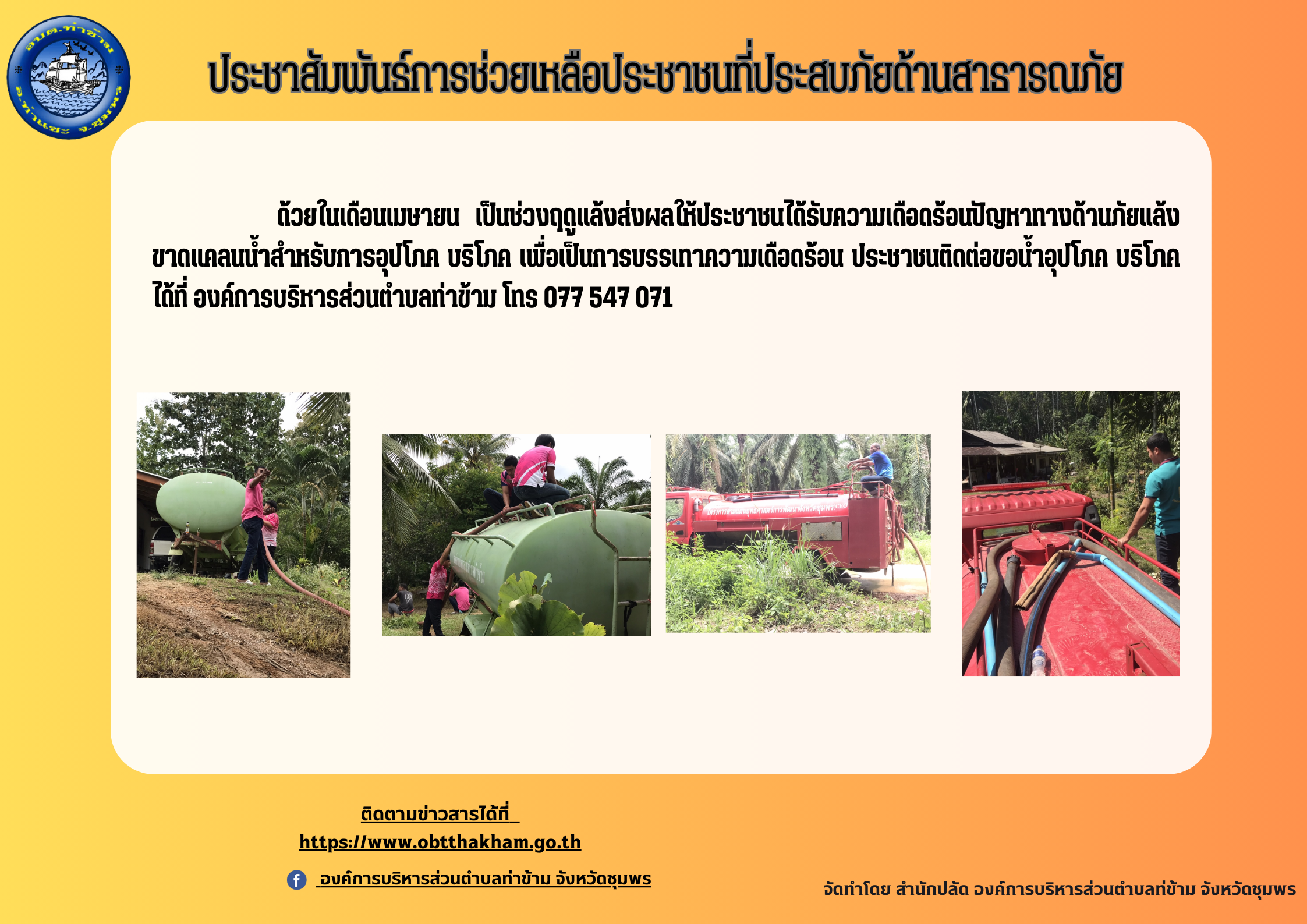 รายละเอียด : ด้วยในเดือนเมษายน เป็นช่วงฤดูแล้งส่งผลให้ประชาชนได้รับความเดือดร้อนปัญหาทางด้านภัยแล้ง ขาดแคลนน้ำสำหรับการอุปโภค บริโภค เพื่อเป็นการบรรเทาความเดือดร้อน ประชาชนติดต่อขอน้ำอุปโภค บริโภค ได้ที่ องค์การบริหารส่วนตำบลท่าข้าม โทร 077 547 071