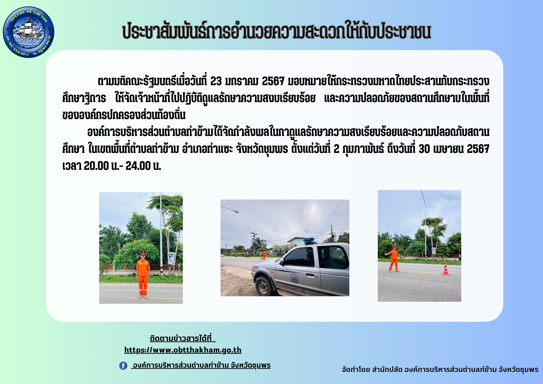 รายละเอียด : ตามมติคณะรัฐมนตรีเมื่อวันที่ 23 มกราคม 2567 มอบหมายให้กระทรวงมหาดไทยประสานกับกระทรวงศึกษาฐิการ ให้จัดเจ้าหน้าที่ไปปฏิบัิติดูแลรักษาความสงบเรียบร้อย และความปลอดภัยของสถานศึกษาบในพื้นที่ขององค์กรปกครองส่วนท้องถิ่นองค์การบริหารส่วนตำบลท่าข้ามได้จัดกำลังพลในกาดูแลรักษาความสงเรียบร้อยและความปลอดภับสถานศึกษา ในเขตพื้นที่ตำบลท่าข้าม อำเภอท่าแซะ จังหวัดชุมพร ตั้งแต่วันที่ 2 กุมภาพันธ์ ถึงวันที่ 30 เมษายน 2567 เวลา 20.00 น.- 24.00 น.