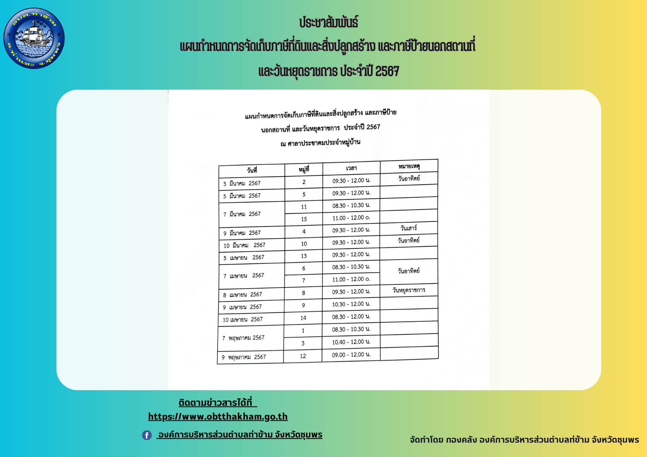 ประชาสัมพันธ์ แผนกำหนดการจัดเก็บภาษีที่ดินและสิ่งปลูกสร้าง และภาษีป้ายนอกสถานที่ และวันหยุดราชการ ประจำปี 2567