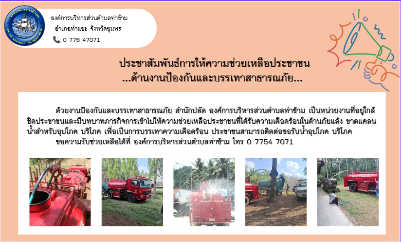 ชื่อเรื่อง : ประชาสัมพันธ์การให้ความช่วยเหลือประชาชน ...ด้านงานป้องกันและบรรเทาสาธารณภัย...