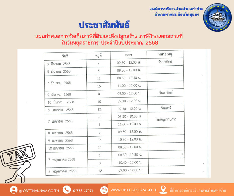 ประชาสัมพันธ์แผนกำหนดการจัดเก็บภาษีที่ดินและสิ่งปลูกสร้าง ภาษีป้ายนอกสถานที่ ในวันหยุดราชการ ประจำปีงบประมาณ 2568