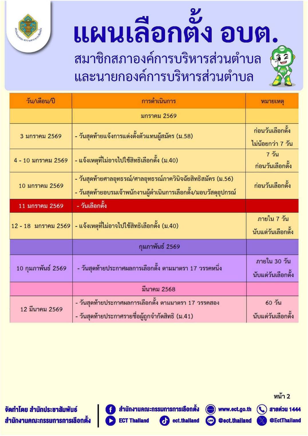 ????คณะกรรมการการเลือกตั้งได้มีมติเห็นชอบแผนการจัดการเลือกตั้งสมาชิกสภาองค์การบริหารส่วนตำบลและนายกองค์การบริหารส่วนตำบล กรณีครบวาระ โดยสมาชิกสภาองค์การบริหารส่วนตำบลและนายกองค์การบริหารส่วนตำบล ที่ได้รับเลือกตั้งเมื่อวันที่ 28 พฤศจิกายน 2564 จะครบวาระการดำรงตำแหน่งในวันที่ 27 พฤศจิกายน 2568 (รายละเอียดตามแผนที่แนบมาพร้อมนี้)