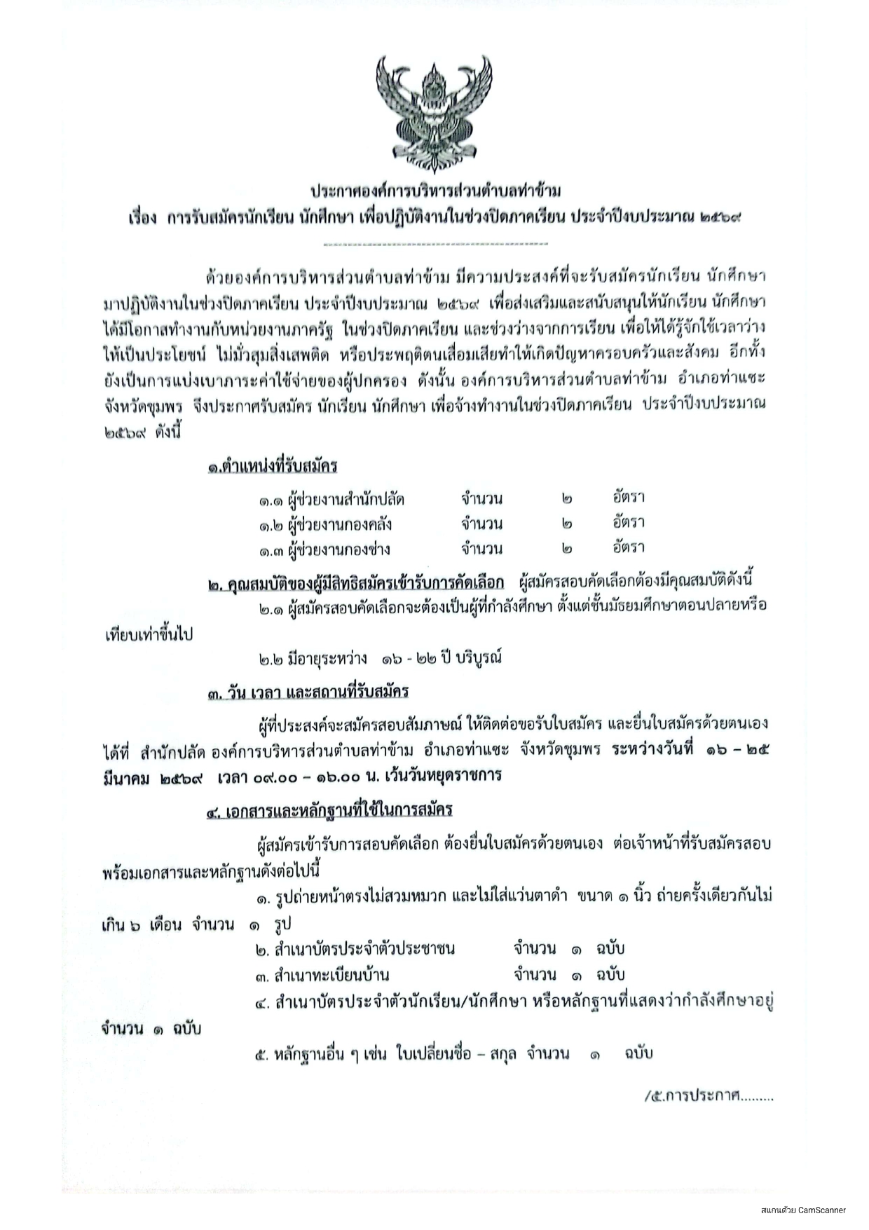 ประกาศองค์การบริหารส่วนตำบลท่าข้าม เรื่อง การรับสมัครนักเรียน นักศึกษา เพื่อปฏิบัติงานในช่วงปิดภาคเรียน ประจำปีงบประมาณ 2569