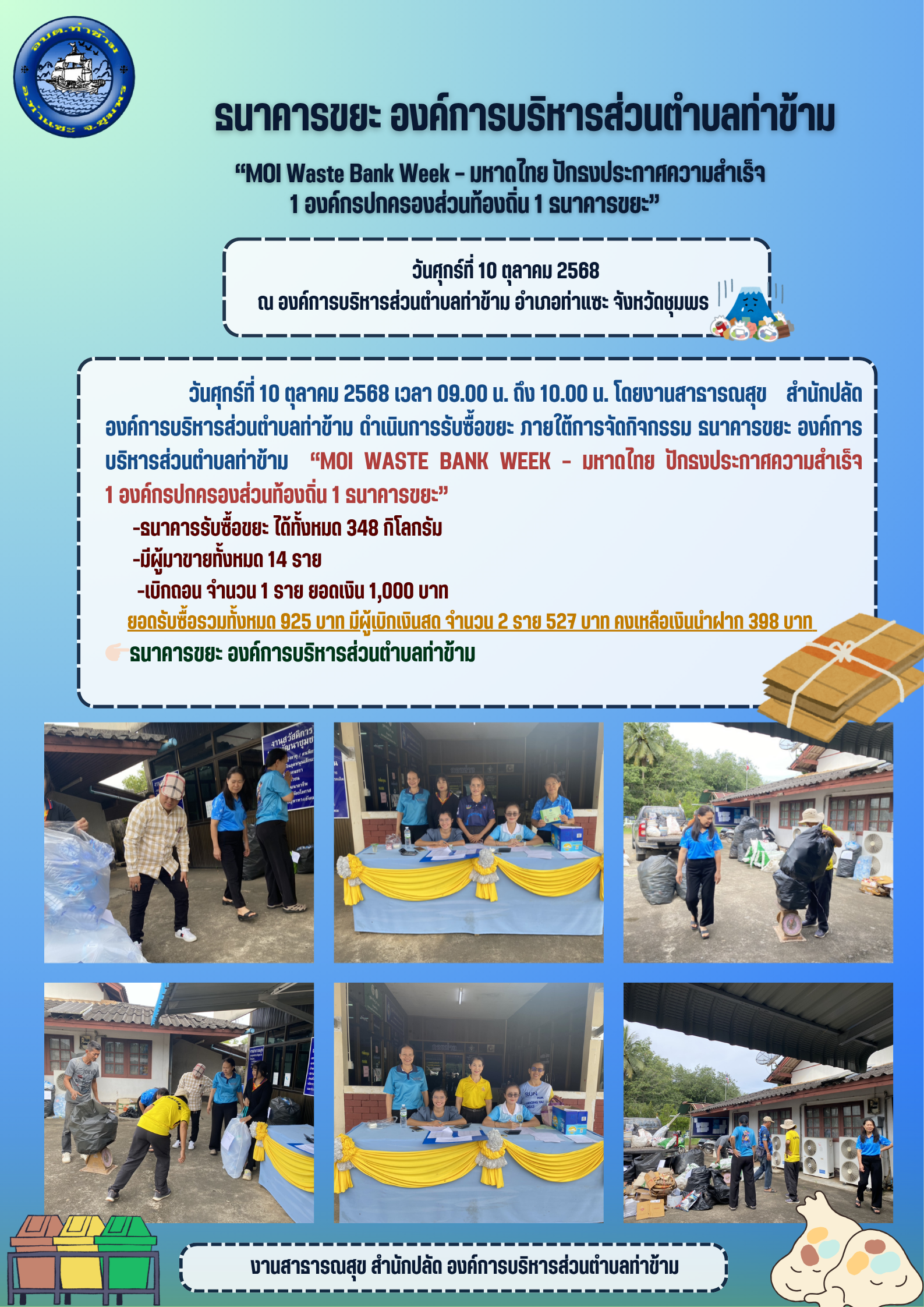 ธนาคารขยะ องค์การบริหารส่วนตำบลท่าข้าม ประจำเดือนกันยายน พ.ศ. 2568 ภายใต้การจัดกิจกรรม “MOI Waste Bank Week – มหาดไทย ปักธงประกาศความสำเร็จ 1 องค์กรปกครองส่วนท้องถิ่น 1 ธนาคารขยะ [10 ตุลาคม 2568]
