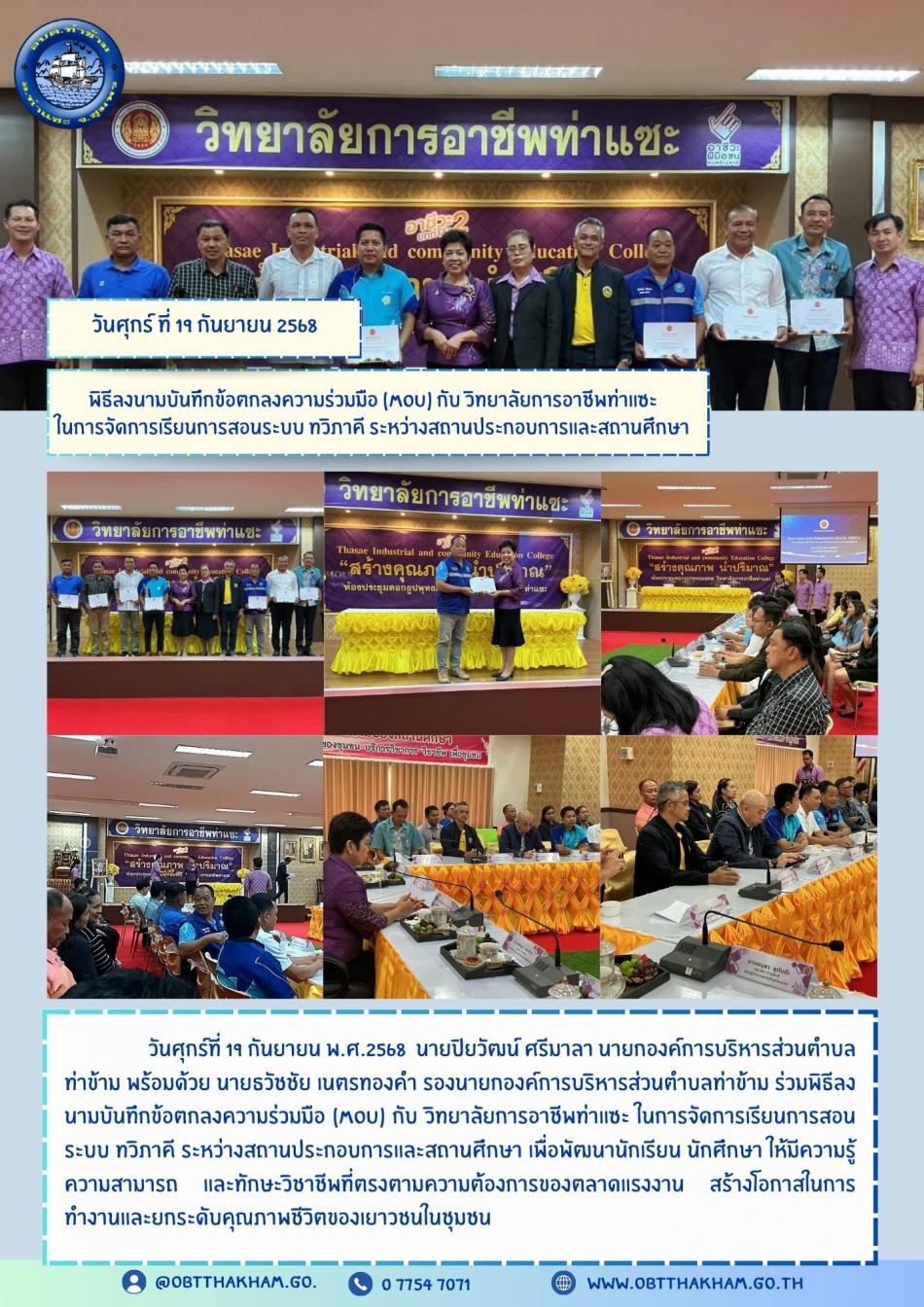 พิธีลงนามบันทึกข้อตกลงความร่วมมือ (MOU) กับ วิทยาลัยการอาชีพท่าแซะ ในการจัดการเรียนการสอนระบบ ทวิภาคี ระหว่างสถานประกอบการและสถานศึกษา [20 กันยายน 2568]