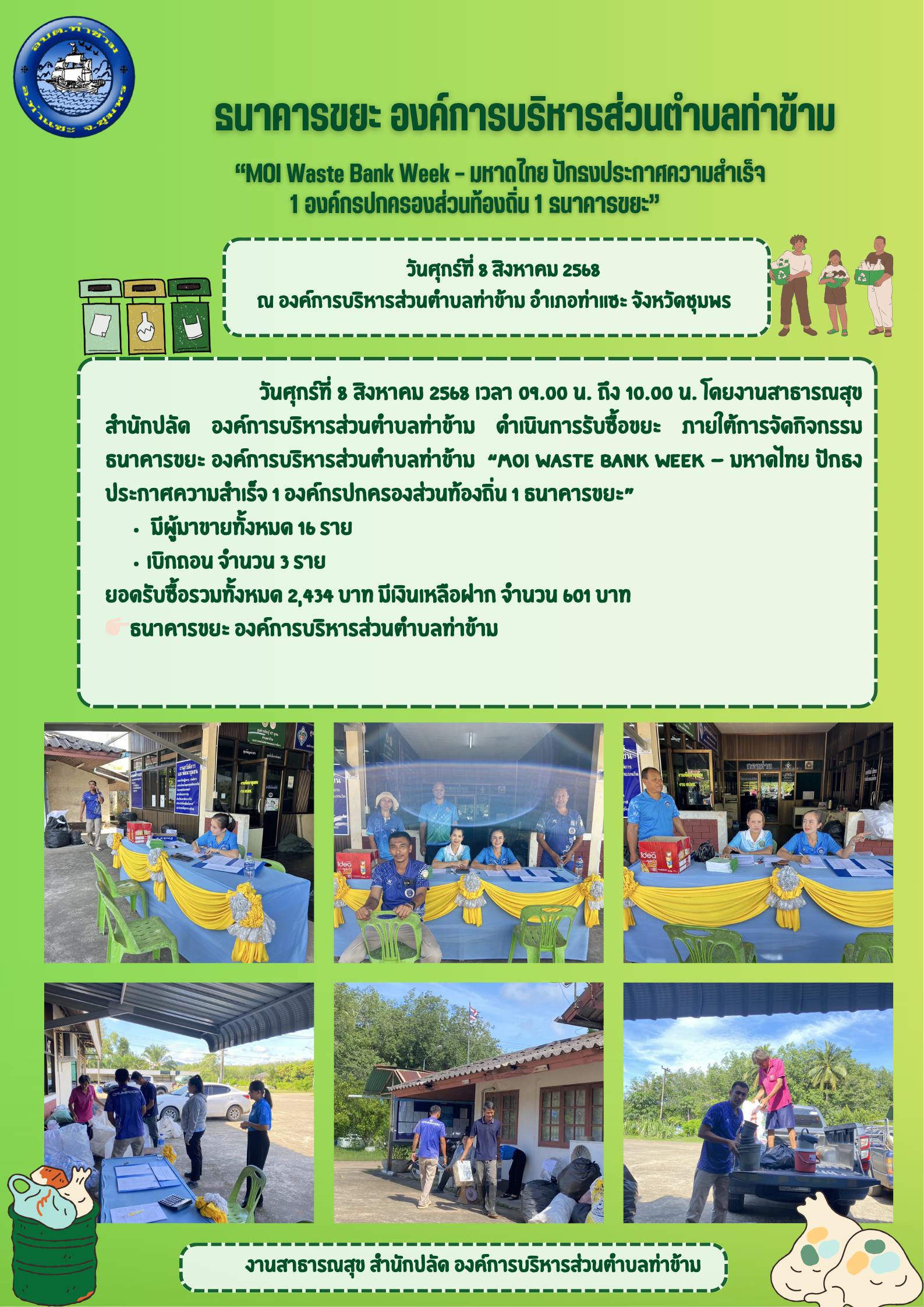 ธนาคารขยะ องค์การบริหารส่วนตำบลท่าข้าม ประจำเดือนสิงหาคม พ.ศ. 2568 ภายใต้การจัดกิจกรรม “MOI Waste Bank Week – มหาดไทย ปักธงประกาศความสำเร็จ 1 องค์กรปกครองส่วนท้องถิ่น 1 ธนาคารขยะ” [10 สิงหาคม 2568]