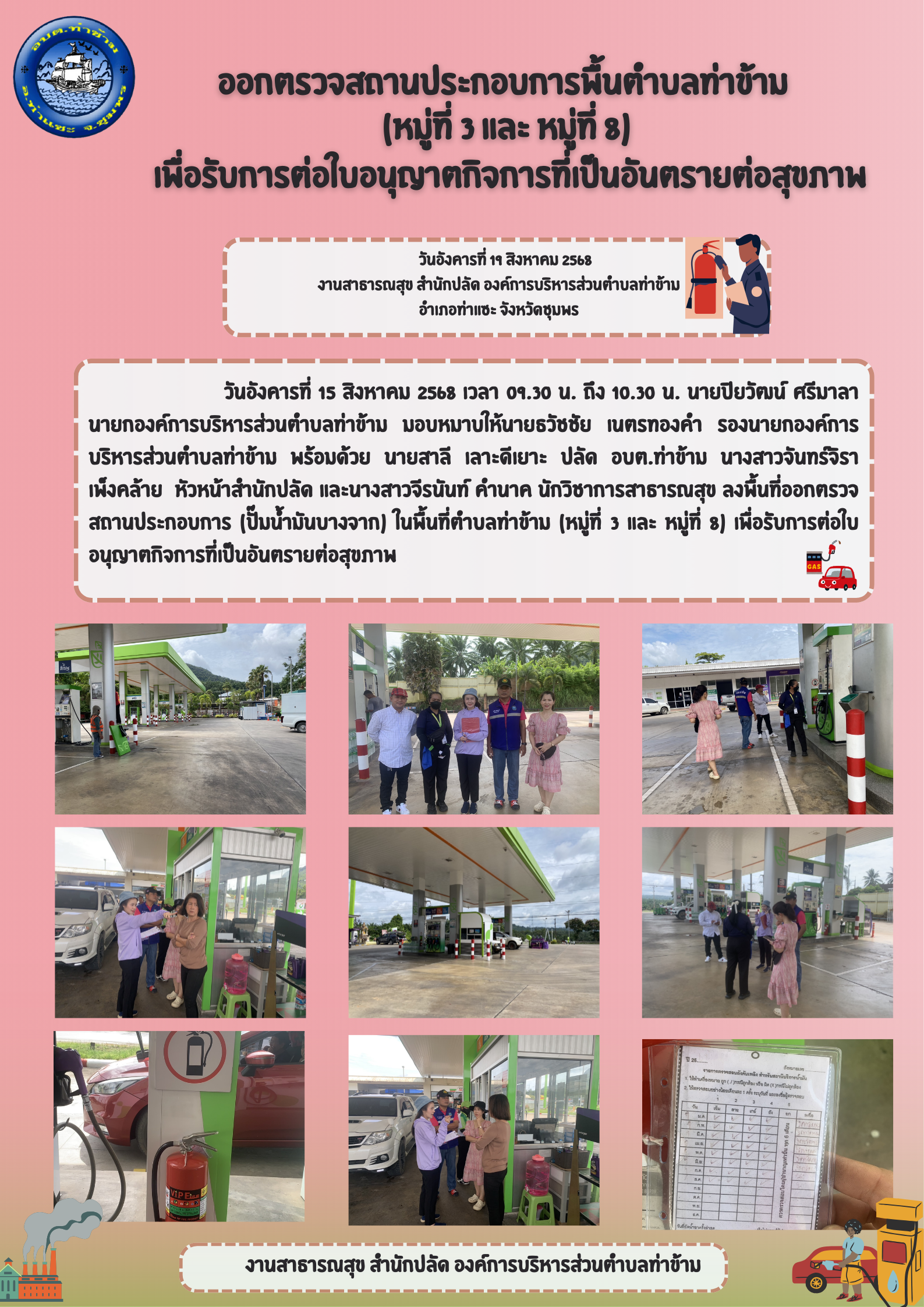 ออกตรวจสถานประกอบการพื้นตำบลท่าข้าม (หมู่ที่ 3 และ หมู่ที่ 8) เพื่อรับการต่อใบอนุญาตกิจการที่เป็นอันตรายต่อสุขภาพ [19 สิงหาคม 2568]