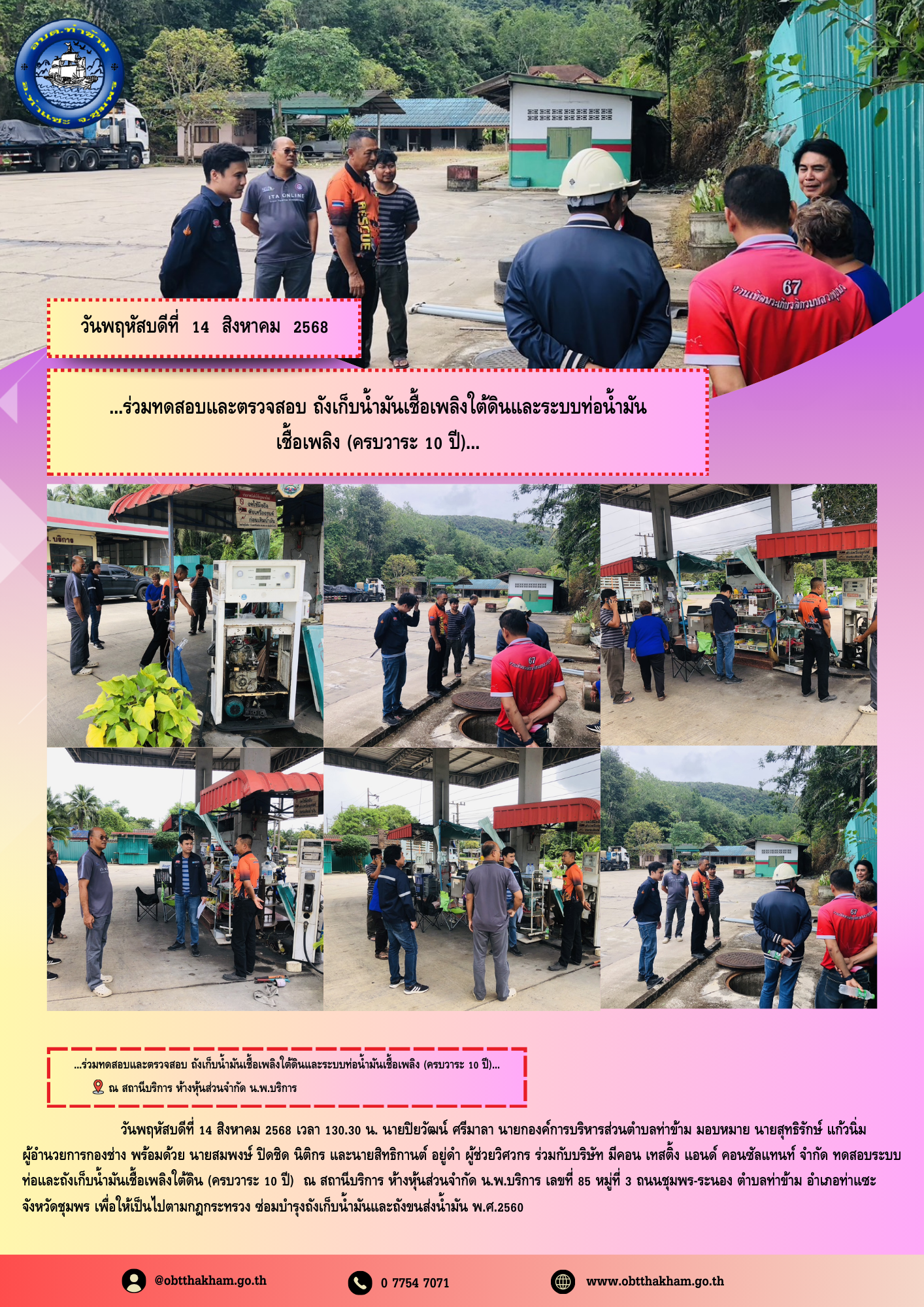 ...ร่วมทดสอบและตรวจสอบ ถังเก็บน้ำมันเชื้อเพลิงใต้ดินและระบบท่อน้ำมันเชื้อเพลิง (ครบวาระ 10 ปี)... [14 สิงหาคม 2568]