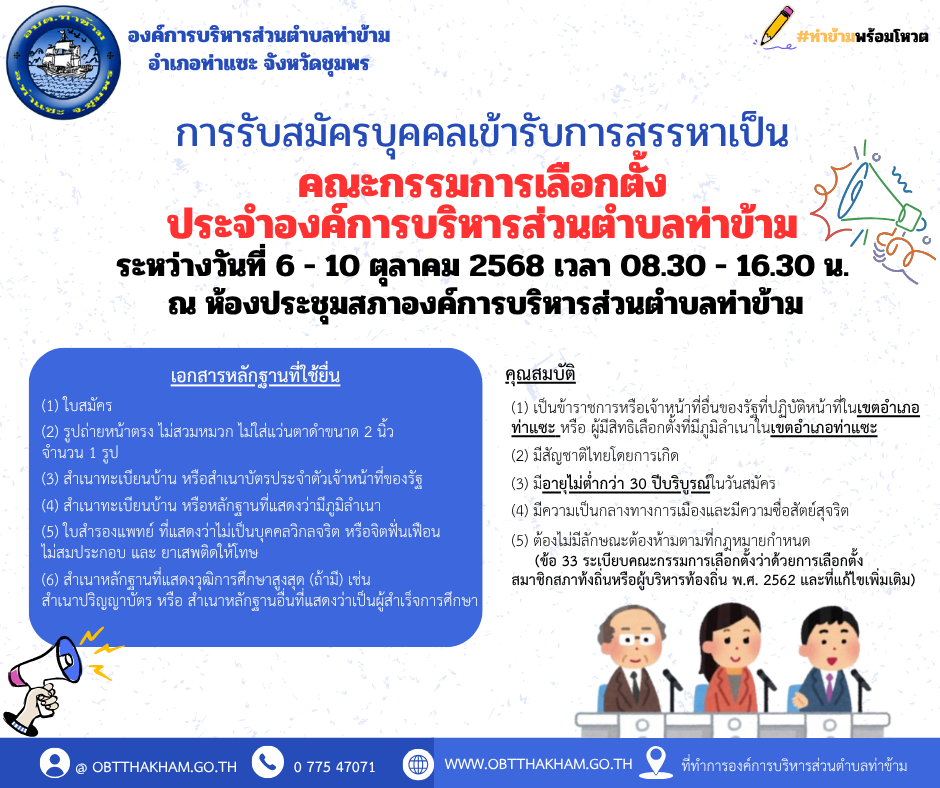ประกาศรับสมัครบุคคลเข้ารับการสรรหาเป็นคณะกรรมการเลือกตั้ง ประจำองค์การบริหารส่วนตำบลท่าข้าม [5 ตุลาคม 2568]