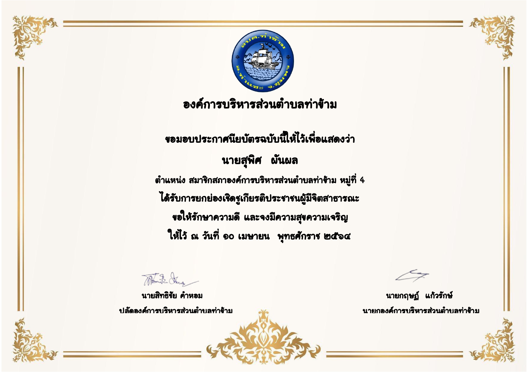 สำนักปลัด องค์การบริหารส่วนตำบลท่าข้าม จัดทํากิจกรรมเชิดชูเกียรติประชาชนผู้มีจิตสาธารณะ เพื่อนําผู้ที่ได้รับการคัดเลือกระดับหมู่บ้านเข้ารับใบประกาศเชิดชูเกียรติและเนื่องในวันสืบสานประเพณี วันสงกรานต์และวันผู้สูงอายุในทุกปีงบประมาณ เพื่อเป็นขวัญกําลังใจให้ประชาชนมีความมุ่งมั่น ช่วยเหลือสังคม และเป็นแบบอย่างต่อบุคคลอื่นในชุมชน