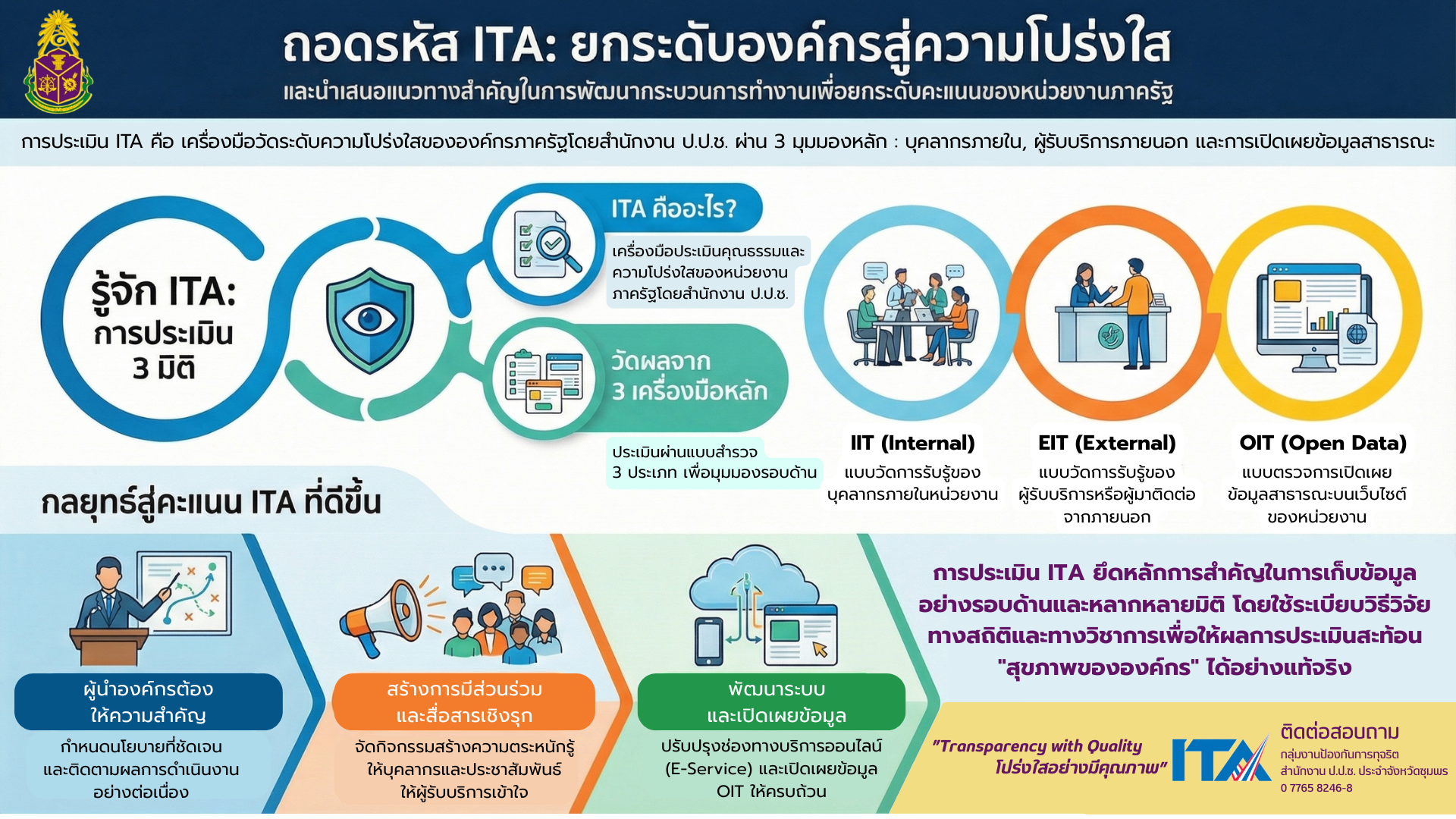 การประเมิน ITA คือ เครื่องมือวัดระดับความโปร่งใสขององค์กรภาครัฐโดยสำนักงาน ป.ป.ช. ผ่าน 3 มุมมองหลัก : บุคลากรภายใน, ผู้รับบริการภายนอก และการเปิดเผยข้อมูลสาธารณะ