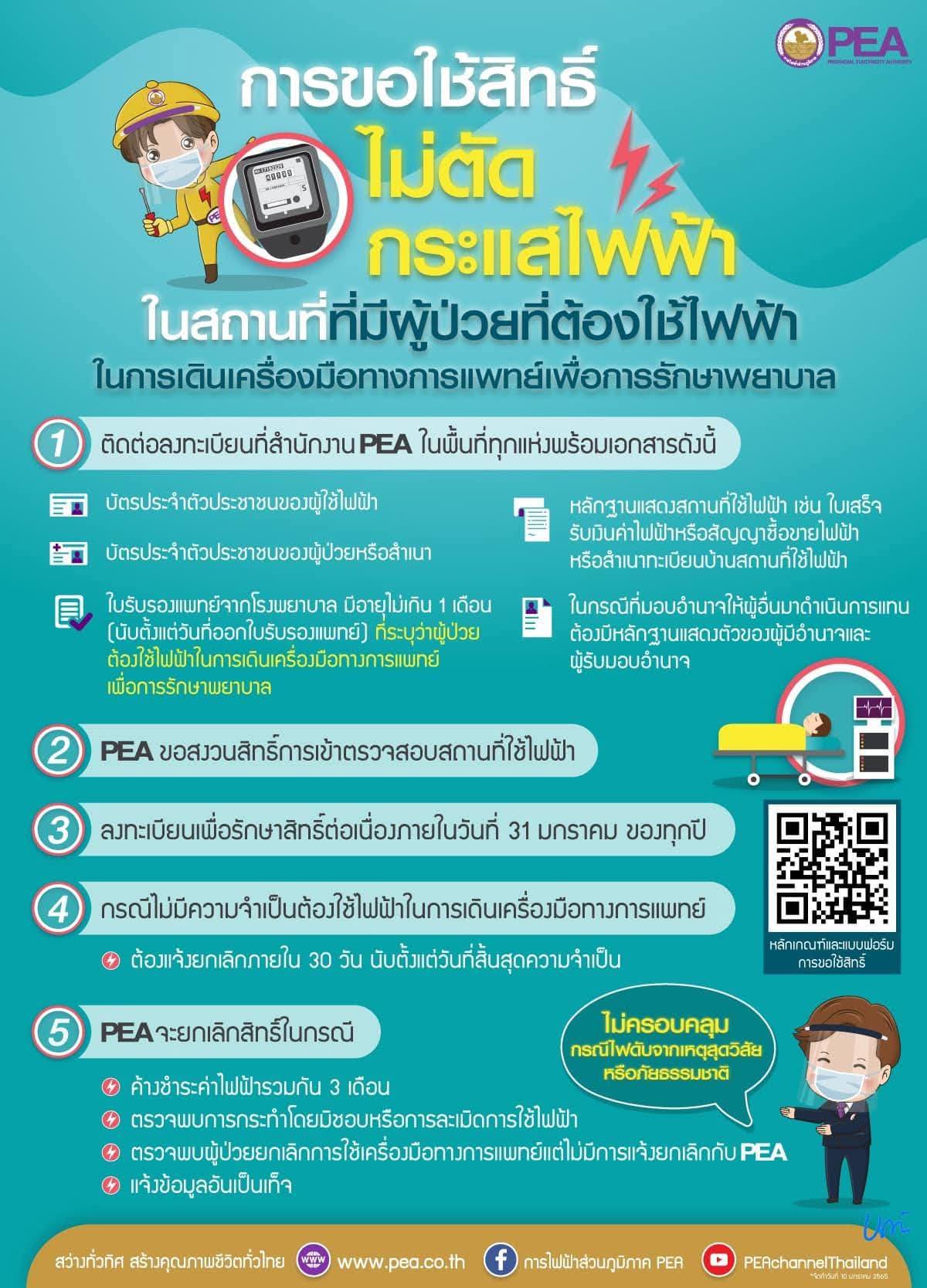 การไฟฟ้าส่วนภูมิภาค มีนโยบายที่จะขยายระยะเวลาการงดจ่ายไฟฟ้ากรณีค้างชำระค่าไฟฟ้าให้แก่ประชาชน สำหรับสถานที่หรือบ้านที่มีผู้ป่วยที่ต้องใช้ไฟฟ้า ในการเดินเครื่องมือทางการแพทย์เพื่อการรักษาพยาบาล โดยผู้ที่สนใจ สามารถติดต่อลงทะเบียนเพื่อขอใช้สิทธิ์ได้ที่สำนักงานการไฟฟ้าส่วนภูมิภาคในทุกพื้นที่